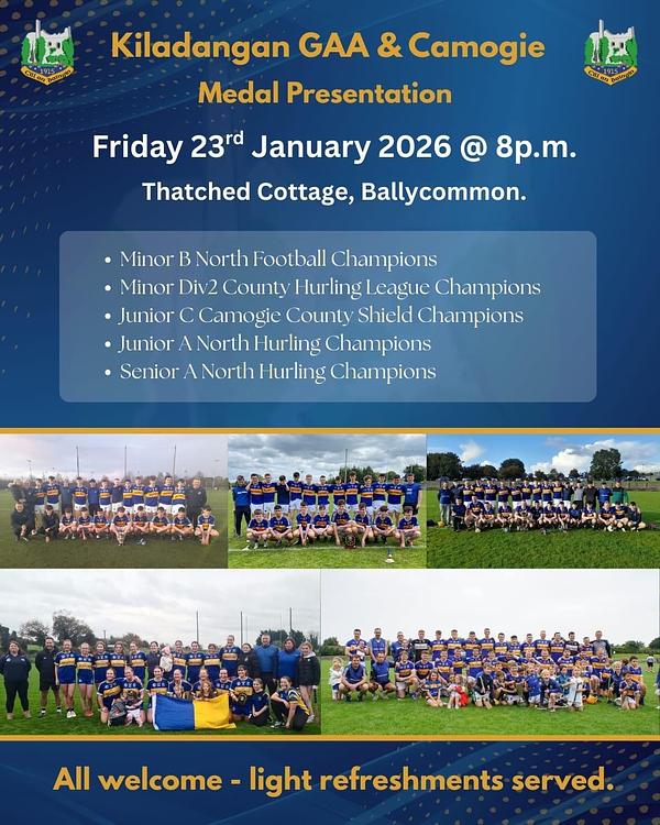 Kiladangan GAA & Camogie Clubs will hold a Medal Presentation this coming Friday 23rd January commencing at 8.00 pm in The Thatched Cottage.