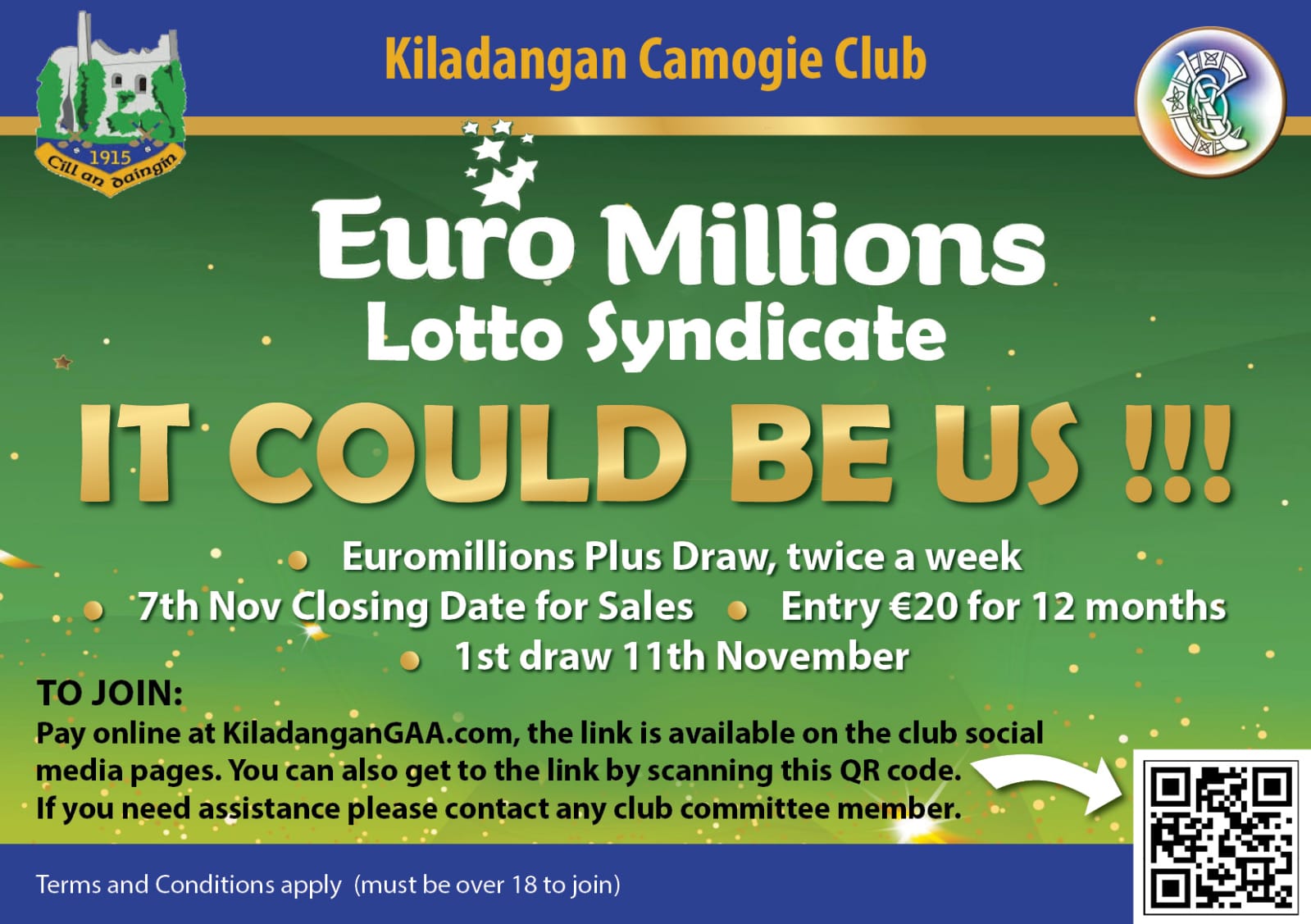 Support Kiladangan Camogie Club by signing up for our Euro Millions Lotto Syndicate. The Euromillions Plus Draw takes place twice a week, with entry just €20 for 12 months.